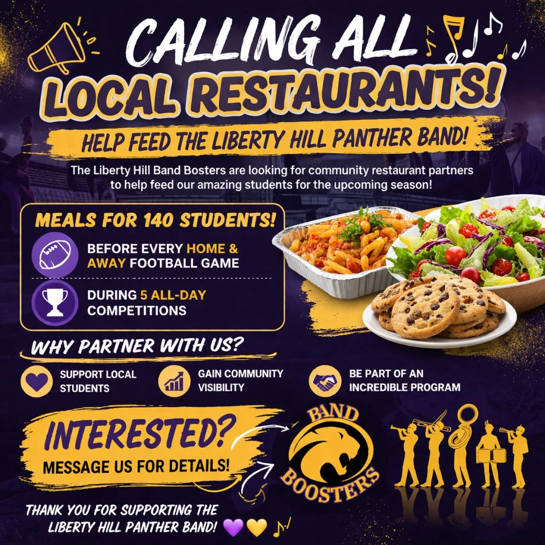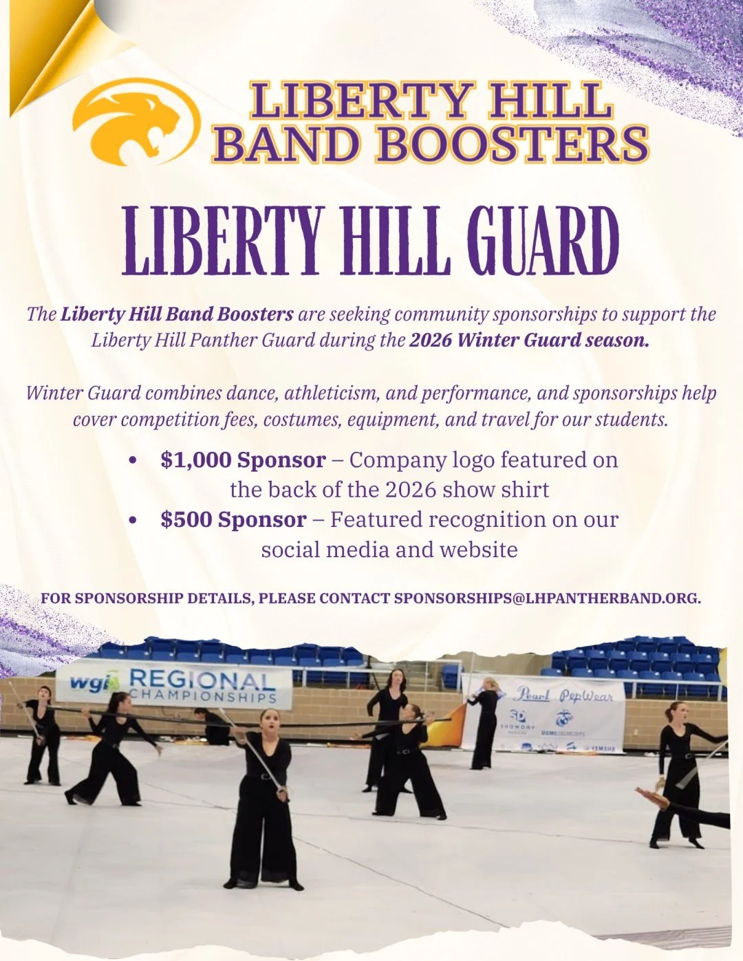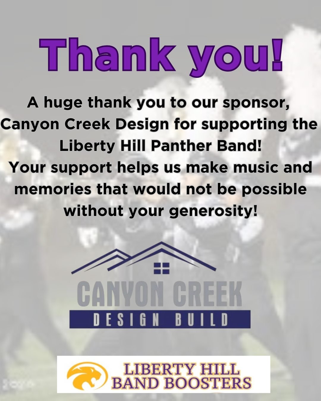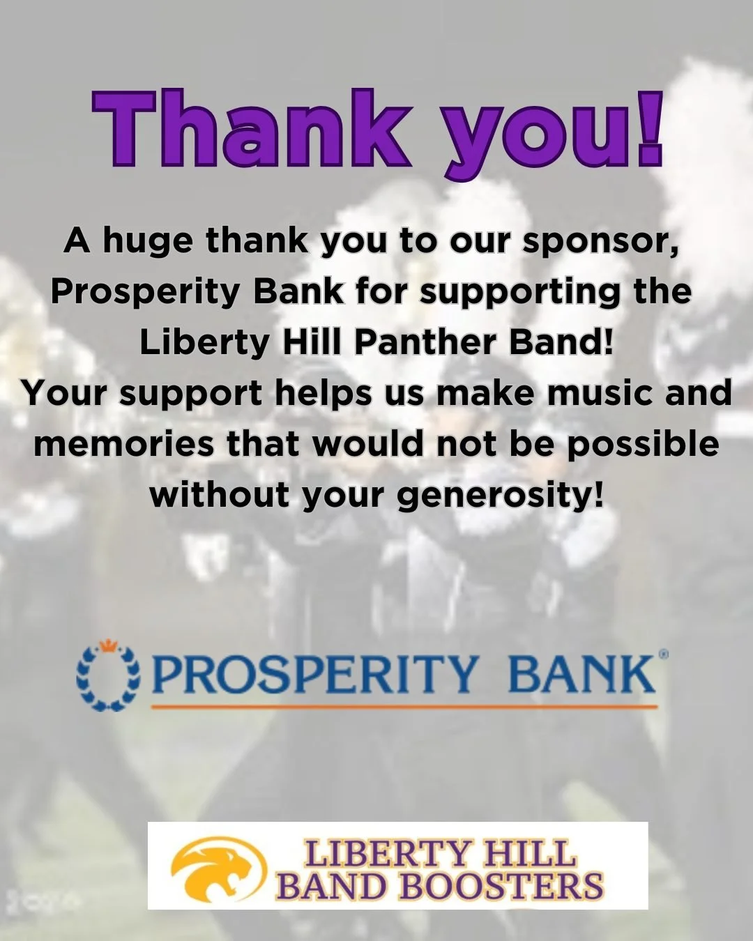 Make a tax-deductible donation today with the button below. Thank you for your support of the Liberty Hill Panther Band & Guard!